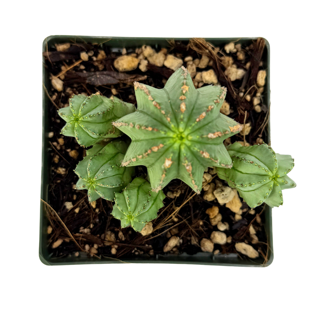 The Euphorbia fruticosa is a rare, shrubby succulent native to South Africa, prized for its branching clusters of upright green stems lined with small spines. Over time, it forms a dense, sculptural mound that adds bold texture to any cactus and succulent collection. In the right conditions, this Euphorbia produces delicate yellow-green flowers that add a subtle touch of color to its architectural form. Drought-tolerant and easy to grow, Euphorbia fruticosa thrives in bright light and well-draining soil, making it both a hardy and collectible addition to your garden or indoor plant display.